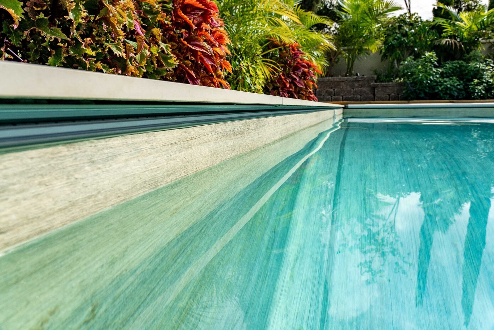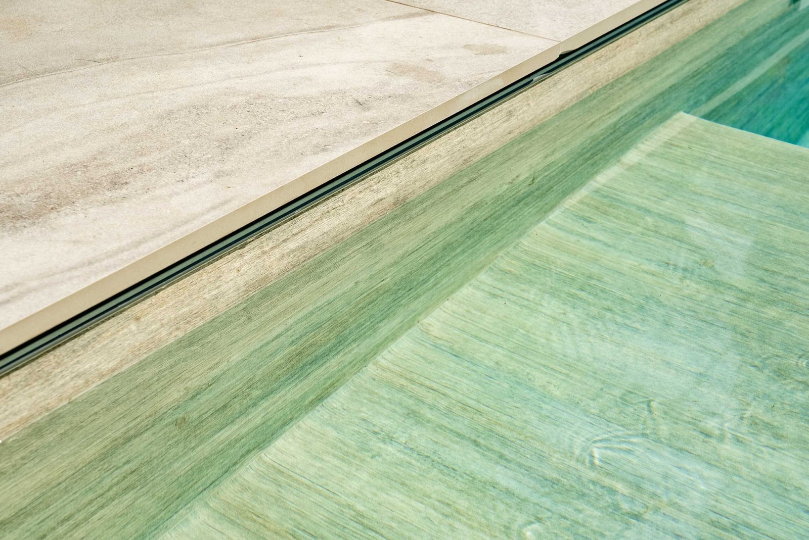 Fuera del agua, destaca su efecto madera auténtica. Bajo el agua, sorprende con un delicado tono verde turquesa que transmite calma, exclusividad y una estética única.