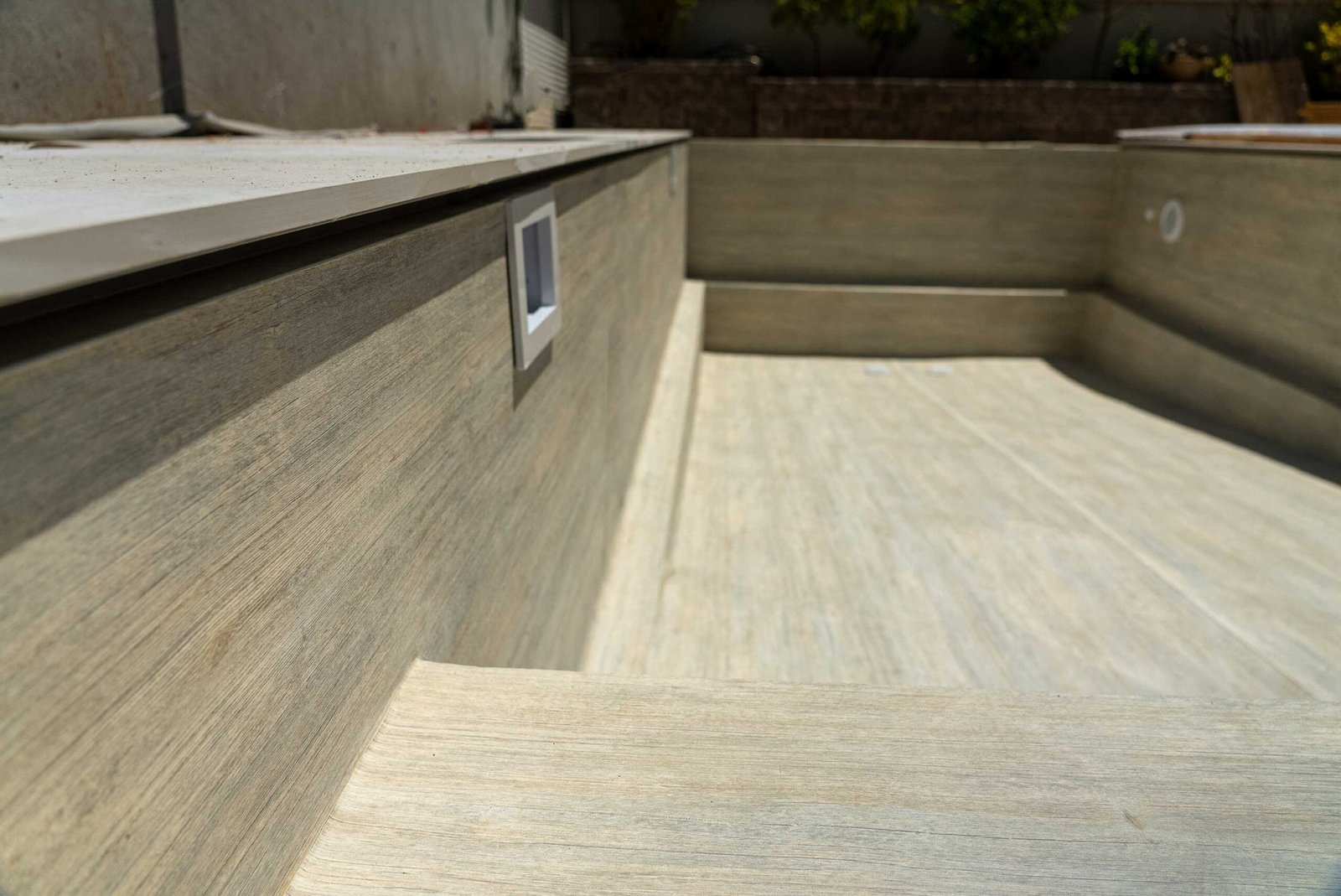 Este revestimiento aporta una nueva dimensión de elegancia y estilo a tu piscina. Reproduce con fidelidad la textura de la madera envejecida, con un acabado 3D que simula vetas naturales y tonos desgastados que evocan la artesanía más refinada.